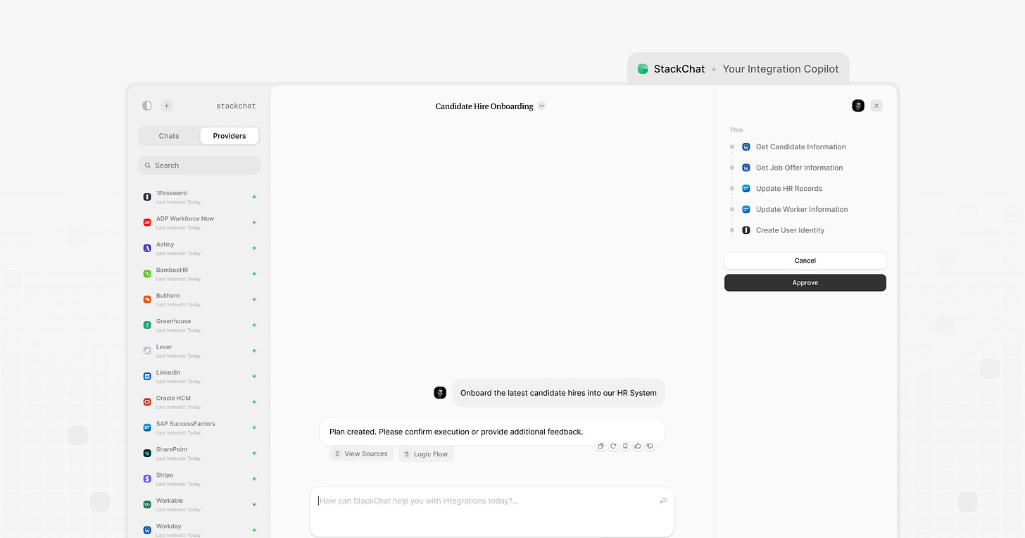 At StackOne, we've built StackChat, a retrieval-augmented chatbot that delivers precise API information by dynamically accessing and synthesizing answers from our proprietary knowledge base, featuring custom retrieval and specialized processing of API specifications. Currently used internally (for now) by our solutions engineers, sales team, and integrations team, this tool streamlines access to our technical documentation.